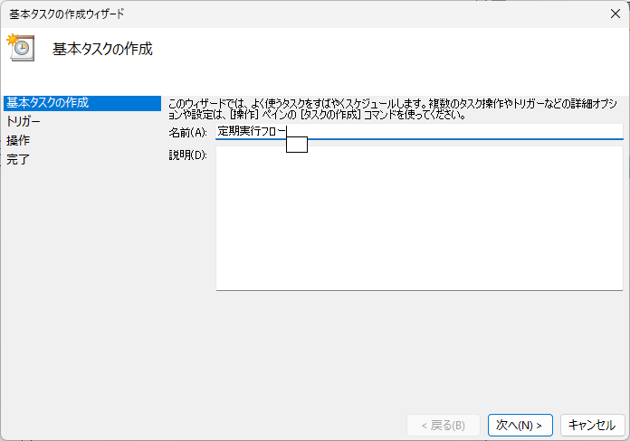 - 名前と説明を入力(例えば「定期実行フロー」)