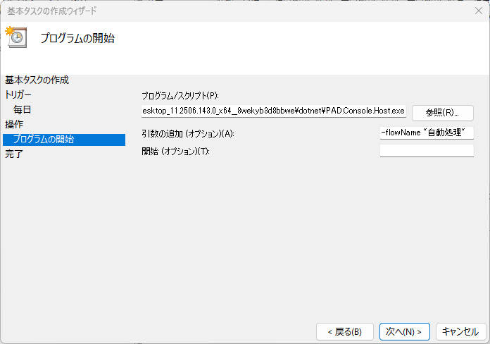 「引数の追加(オプション)」欄に、-flowName “フロー名" ここで run –name “フロー名"という説もある。