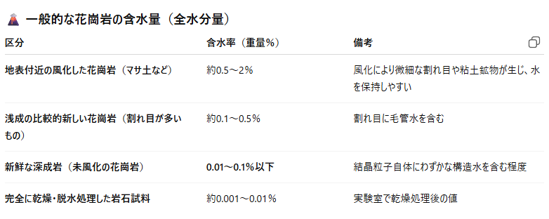 なんか樽で20年熟成しているとか書いてあるわけですが、なんでしょうこれは。花崗岩を粉にして液体を絞り出し、それを20年熟成させるとか本当なのでしょうか。どの程度の水分が含まれるかChatGPTに聞いてみましょう。