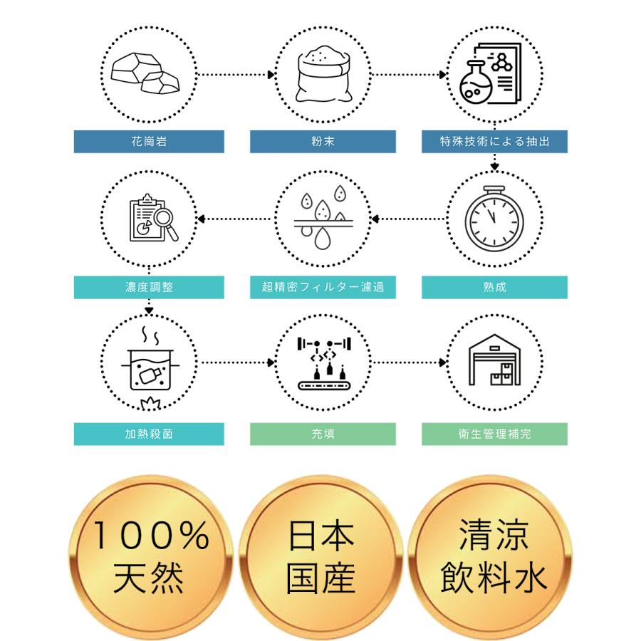 おそらく現実的な製法としては、粉末化した花崗岩に水を入れて可溶イオン分を溶かしだすといったあたりでしょうか。結局のところ、いろいろなミネラルが含まれていると説明には書いてありますが具体的な濃度が記載されていない辺り、理屈の上ではめっちゃ微量が溶けているのを強弁しているだけのような気もします。